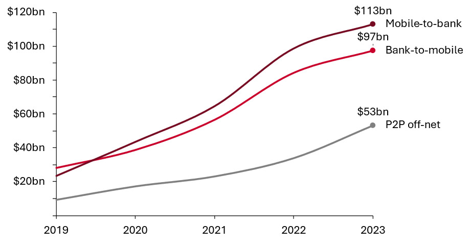 The global (Africa inclusive) digital interoperability transaction values between mobile money financial services and banks grew to over $113bn in mobile-to-bank transfers with more than $97bn in bank-to-mobile transfers and about $53bn in P2P (Person-to-Person) off-net transfers in the periods 2019 to 2023 as shown in Figure 1.