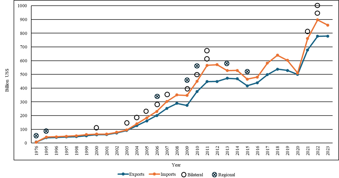 As shown in Table 1, India has concluded 13 bilateral and 5 regional trade agreements, in addition to the FTA with the UK, over the past four decades, with negotiations currently underway for additional four regional pacts. This surge in trade agreements underscores India’s strategic intent to integrate deeply into the global economy. Majority of these agreements have been established with neighbouring South Asian countries, reinforcing India’s stature as a regional leader and its commitment to regional development. The FTAs have delivered clear benefits for India, as confirmed by Figure 1, which illustrates sustained growth in trade flows following their implementation.